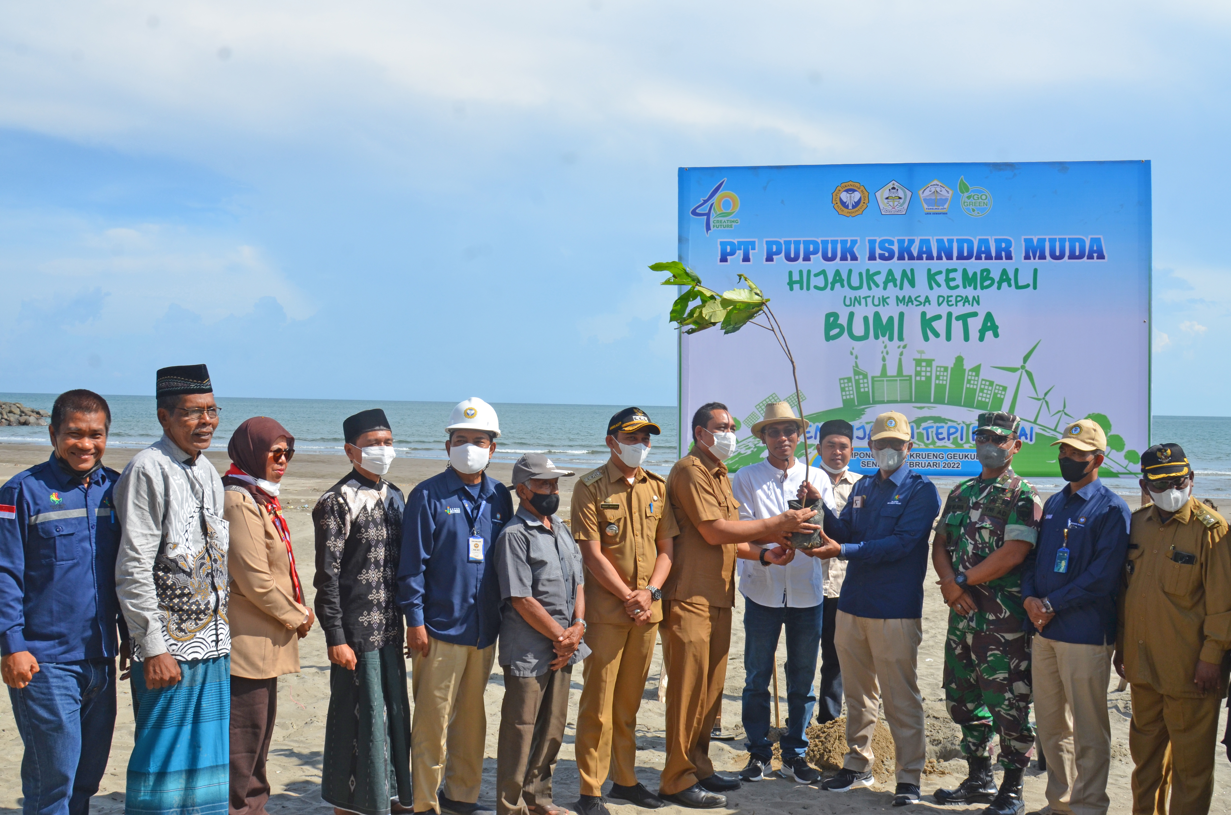 Krueng Geukueh - PT pupuk Iskandar Muda (PIM) melakukan penghijauan dengan menanam ratusan pohon Ketapang di pantai laut Krueng Geukueh, Kecamatan Dewantara, Aceh Utara, Senin (21/2/2022).